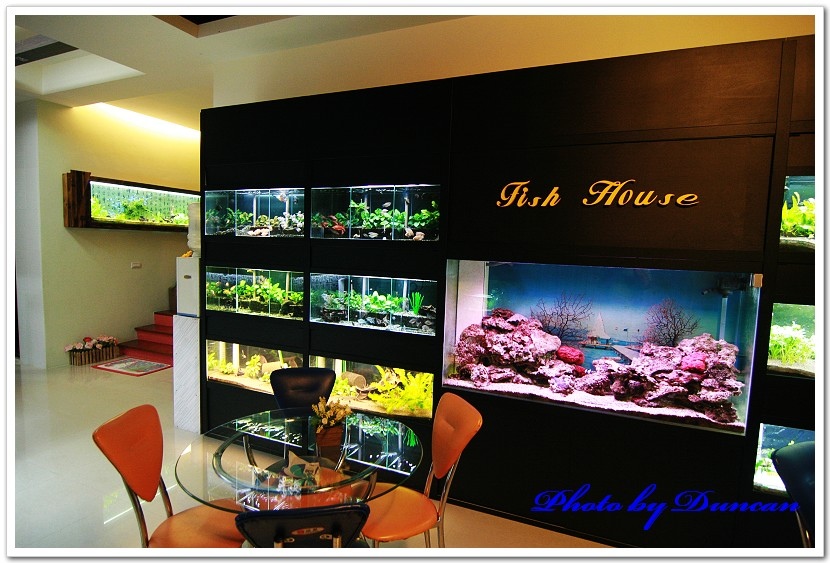 每層樓的樓梯玄關,都有一面這樣的水族箱,水啦!